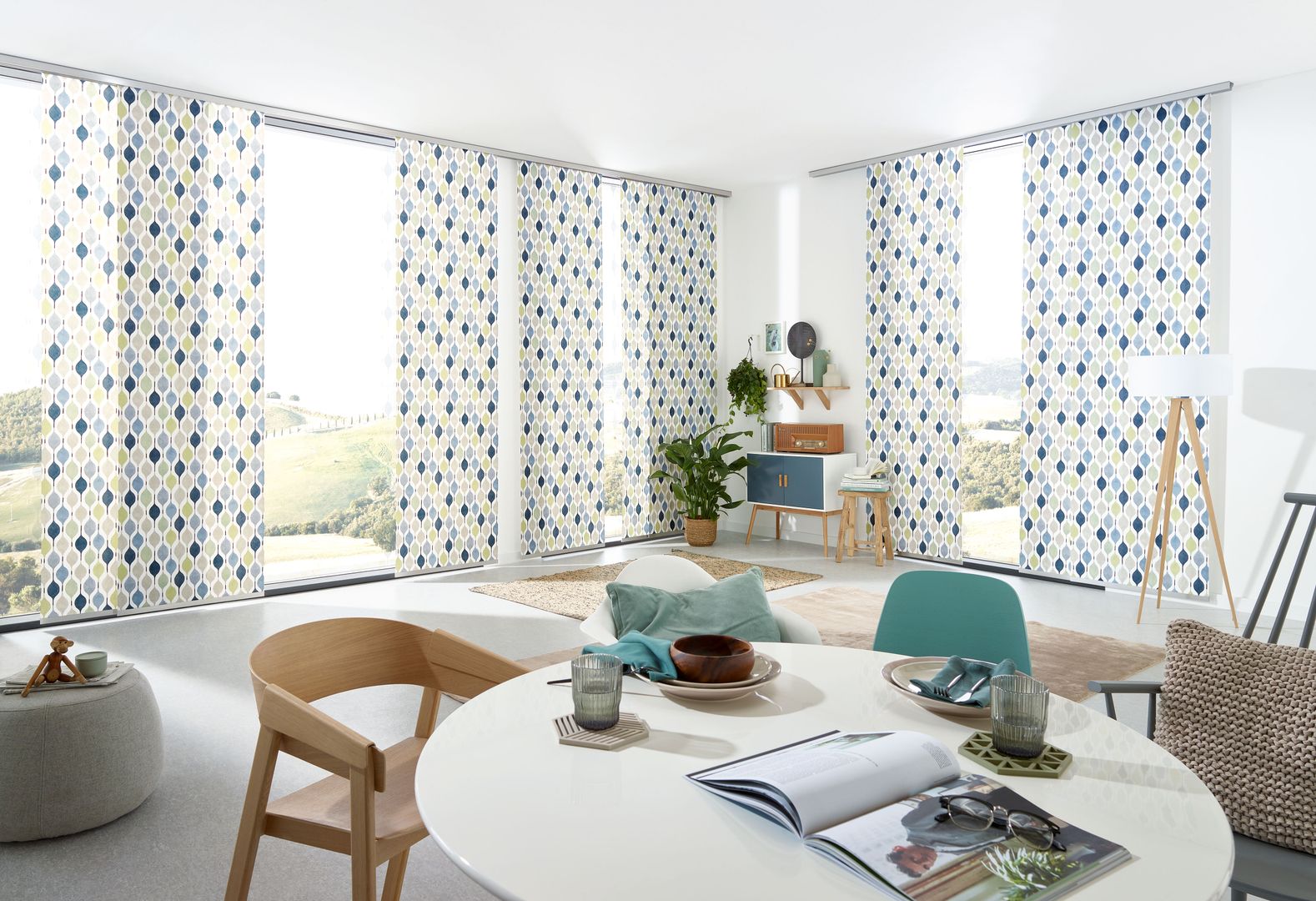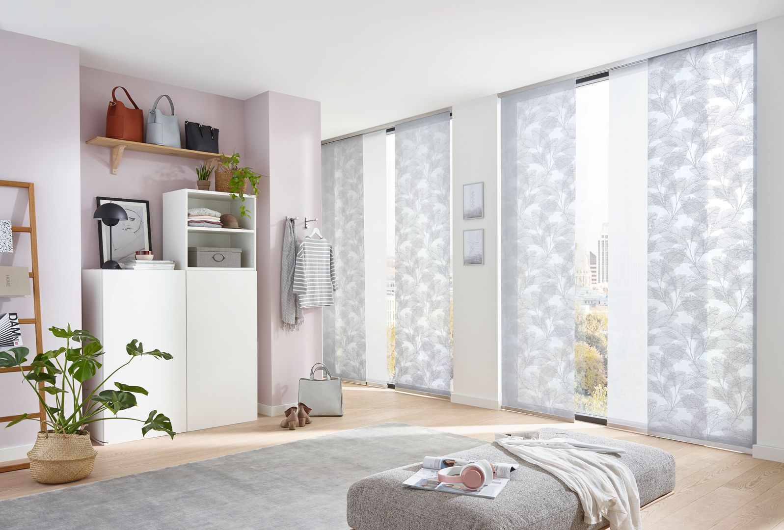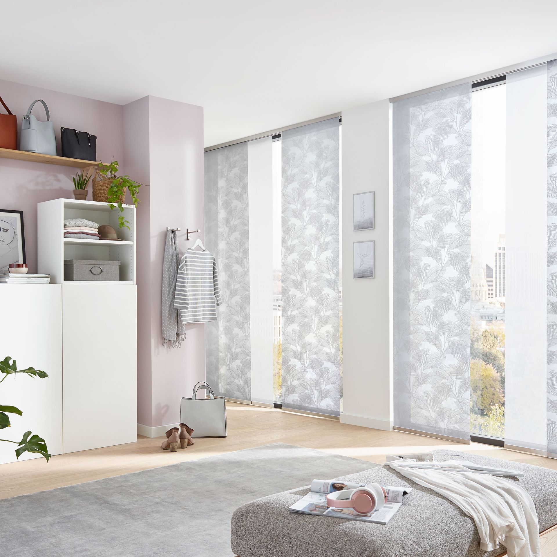 Die Paneele sind in individuellen Größen und praktisch unendlich vielen verschiedenen Stoffdesigns erhältlich. Die Paneele lassen sich einfach abnehmen und austauschen (Befestigung mittels Klettband). Die Montage der Schiebevorhänge erfolgt wahlweise an Wand oder Decke. Besonders für große Fenster, Glasfronten oder als Raumteiler bestechen Flächenvorhänge mit ihrer modernen, reduzierten Formensprache.